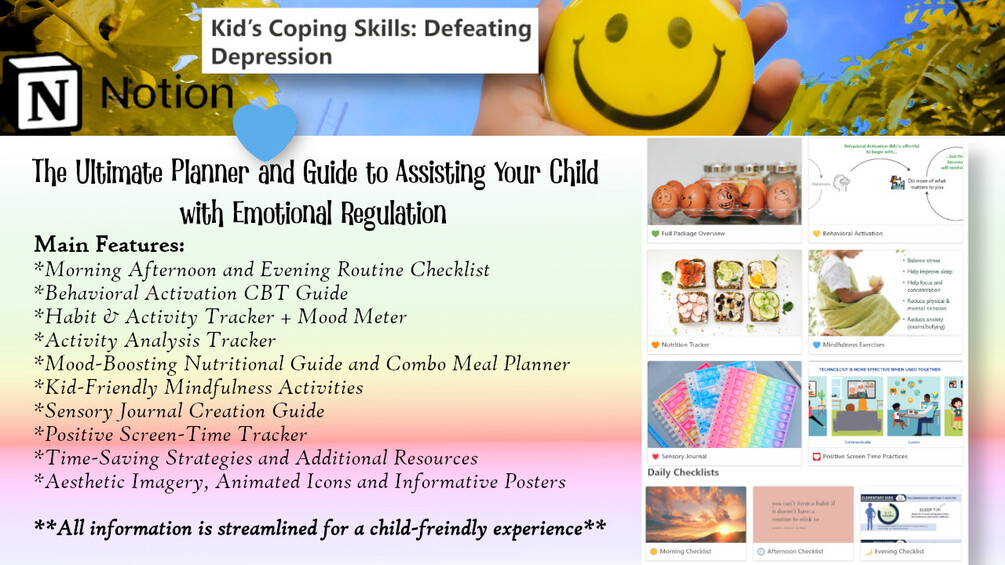 This multi-faceted Notion Template comes with a comprehensive guide and in-depth strategy for assisting children with emotional regulation. The interactive templates streamline the process for parents/caregivers to teach kids coping skills, specifically focused on (but not limited to) combating depression and anxiety.